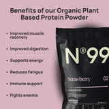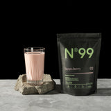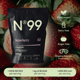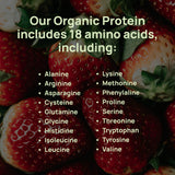organic pea protein (100% pea protein isolate), organic brown rice protein (100% rice protein isolate), strawberry powder (100% strawberry fruit powder), natural flavouring (maltodextrin, natural flavouring, gum acacia), thickener (xanthan gum), red beetroot powder (99% beetroot powder, 1% anti-caking agent), ground basil powder (100% basil powder), salt, sweetener (steviol glycosides), vitamin B12 (maltodextrin, cyanocobalamin)